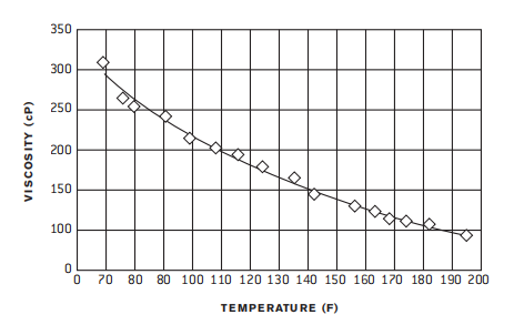 Durch das Verständnis der Produkteigenschaften, die die Effizienz der einzelnen Geräte beeinflussen, lässt sich im Vorfeld bestimmen, welche Maschine für den jeweiligen Zweck geeignet ist. Beispielsweise arbeitet der Homogenisator am effizientesten bei niedriger Produktviskosität, insbesondere in der dispersen Phase⁸. Übersteigt die Viskosität des Silikonöls 1000 cP (Newtonsch), erzeugt der Homogenisator keine zufriedenstellende Emulsion. Selbst bei hohen Drücken von 5000 bis 8000 psi ist der Homogenisator nur sehr ineffizient bei der Reduzierung der Tröpfchengröße. Idealerweise sollte die Viskosität für eine optimale Nutzung des Homogenisators unter 500 cP liegen. Das Erhitzen einer Silikonemulsion ist möglicherweise nicht zielführend, da viele Silikonöle keine signifikante Viskositätsabnahme mit steigender Temperatur aufweisen. Abbildung 1 zeigt ein Beispiel für die Viskositätsänderung eines bestimmten Silikonöls. In diesem Fall würde Erhitzen die Ölviskosität senken und die Homogenisierung effizienter gestalten. Für die Herstellung von Emulsionen mit hochviskosen Ölen sollte eine Kolloidmühle verwendet werden.