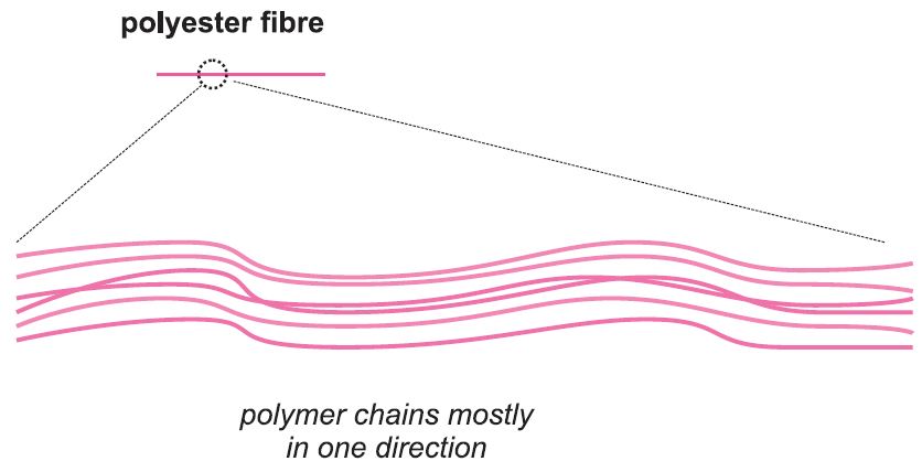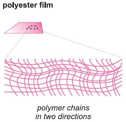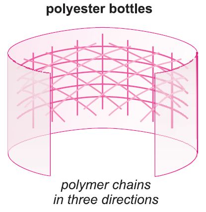 In PET-Fasern sind die Moleküle überwiegend in eine Richtung ausgerichtet, in Folien in zwei Richtungen und in Verpackungen in drei Richtungen (siehe Abbildung 1).