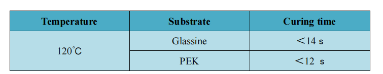 (Die Aushärtungszeit ist definiert als die minimale Aushärtungszeit ohne Verschmieren, ohne Abrieb und Migration der Trennbeschichtungsschicht)